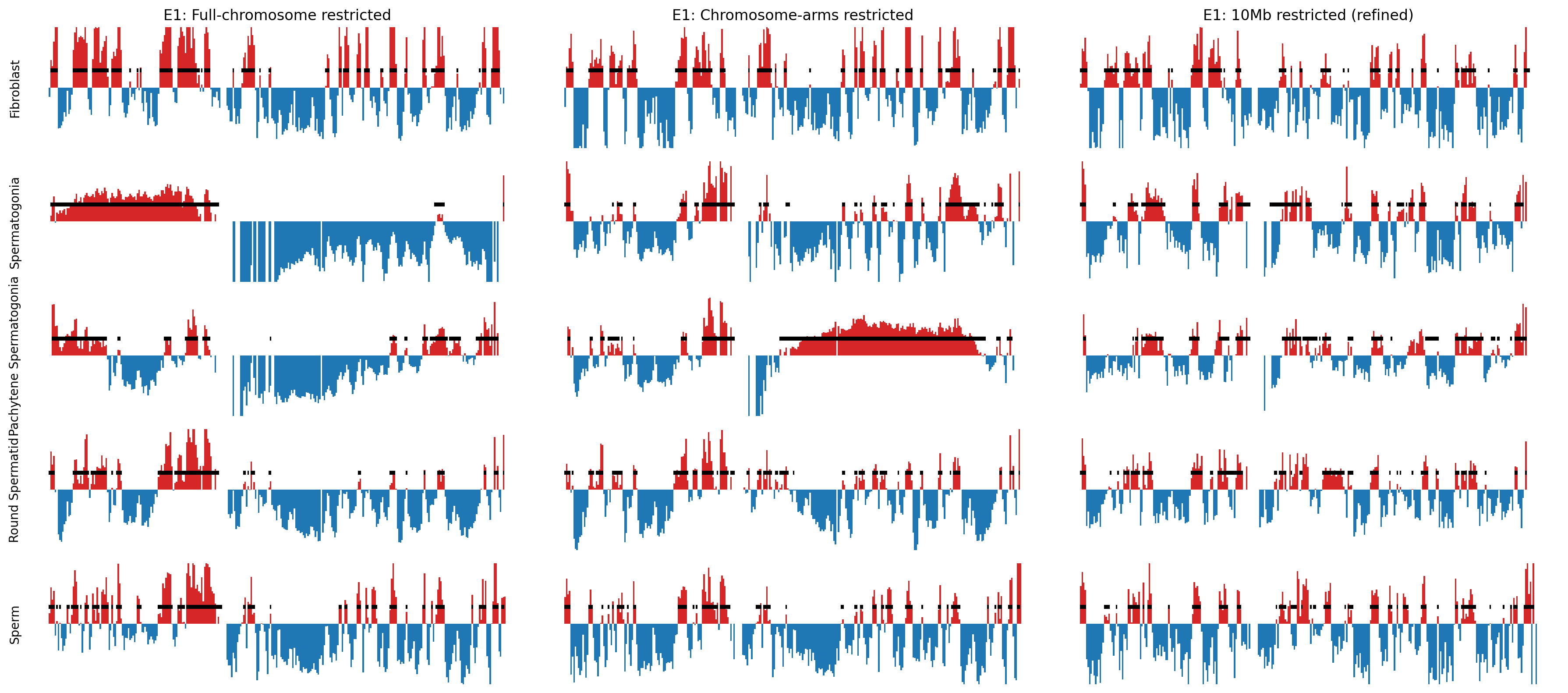 # fig-cap: "E1 eigenvector values for all merged samples at 100kb resolution. Left: Chromosomes (not restricted) Middle: Chromosome-arm restricted E1. Right: 10Mb window restricted E1.Values are smoothed with a sliding window of 5 bins, step size 1 bin."