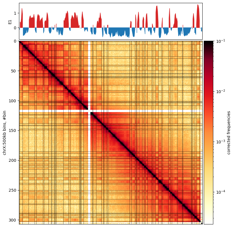 A note from the authors of cooltools is that we always have to inspect the E1 values to see how well it captures the compartments in the matrix. Here, it actually doesn’t do very well, So i’m not sure what went wrong. The E1 values seem to have a lot of sign changes, that are not visible in the plot. Maybe it looks better with 500kb resolution.