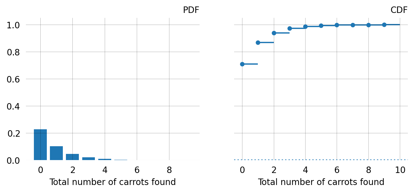 mutations = np.arange(10)pmf = rev_trans_mutation_graph.pdf(mutations)cdf = rev_trans_mutation_graph.cdf(mutations)fig, (ax1, ax2) = plt.subplots(1, 2, figsize=(8, 3), sharey=True)x = np.arange(0, 10, 1)ax1.bar(x, pmf)ax1.set_title("PDF")ax1.set_xlabel('Total number of carrots found')left, right = x, np.arange(1, x.size+1, 1)ax2.hlines(y=cdf, xmin=left, xmax=right, zorder=1)ax2.scatter(left, cdf, s=18, zorder=2)ax2.set_title("CDF")ax2.set_xlabel('Total number of carrots found')ax2.axhline(y=mutation_graph.defect(), linestyle='dotted') ;