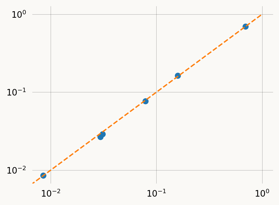 plt.plot([0, 1], [0, 1], ls='--', c='C1')