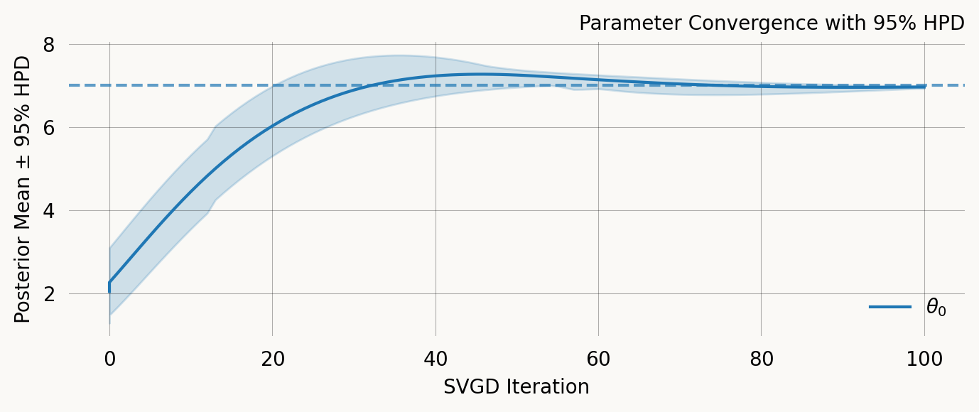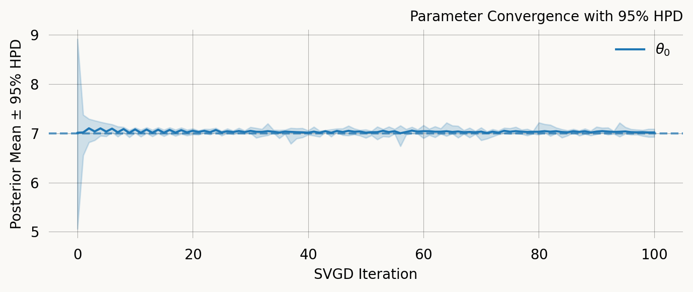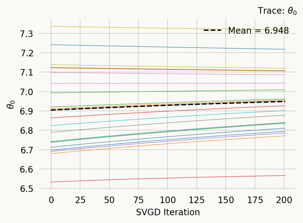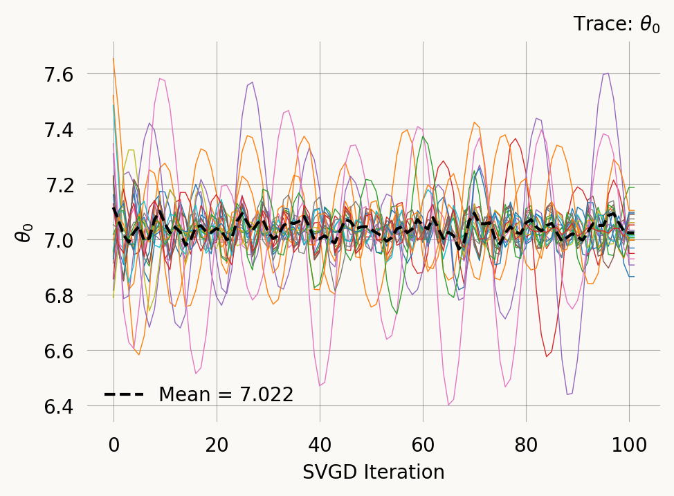 However, you should always evaluate convergence of the SVGD optimization. The plot_trace, shows the parameter values of each particle across iterations: