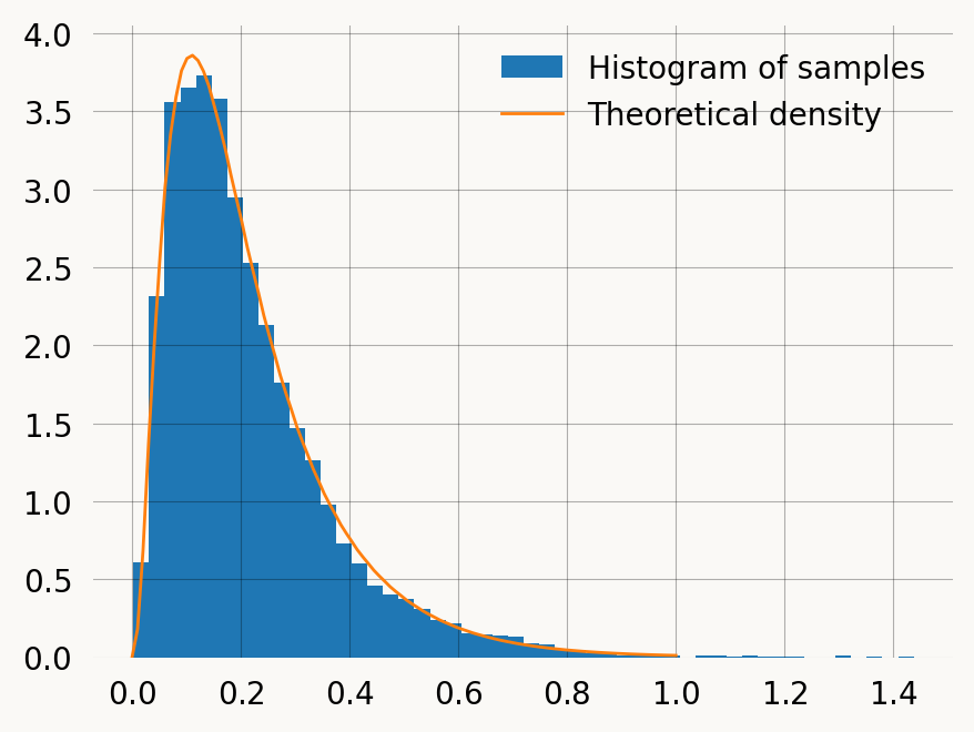 With a large set of observed times to the most recent common ancestor (TMRCA), we can fit our model to find the most likely value of the model parameter. For this turorial we will just set the model parameter to 7 and then sample from the model to get such a data set. This has the advantage that we know what the model parameter is supposed to be.