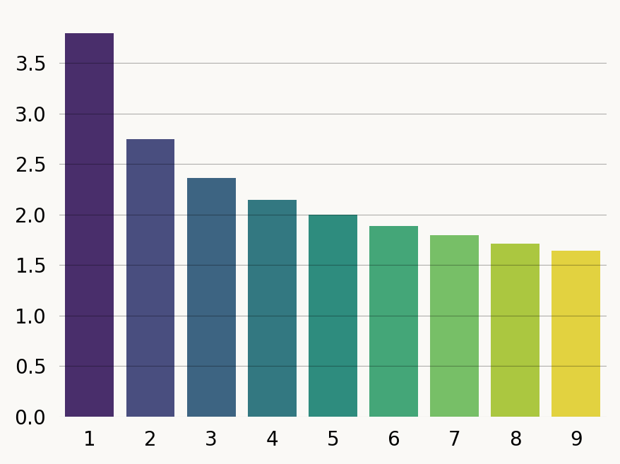 sns.barplot(x=x, y=sfs, hue=x, width=0.8, palette='iridis', legend=False);Comparing to the exact results of Pool and Nielsen for pairwise coelescence time