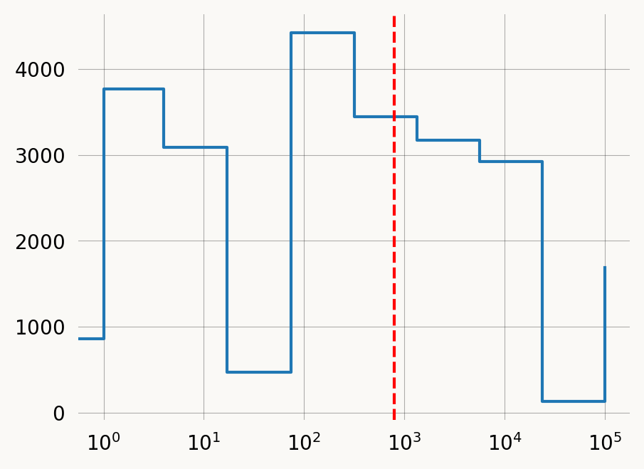plt.gca().axvline(exp_coal_time, color='red', linestyle='--')