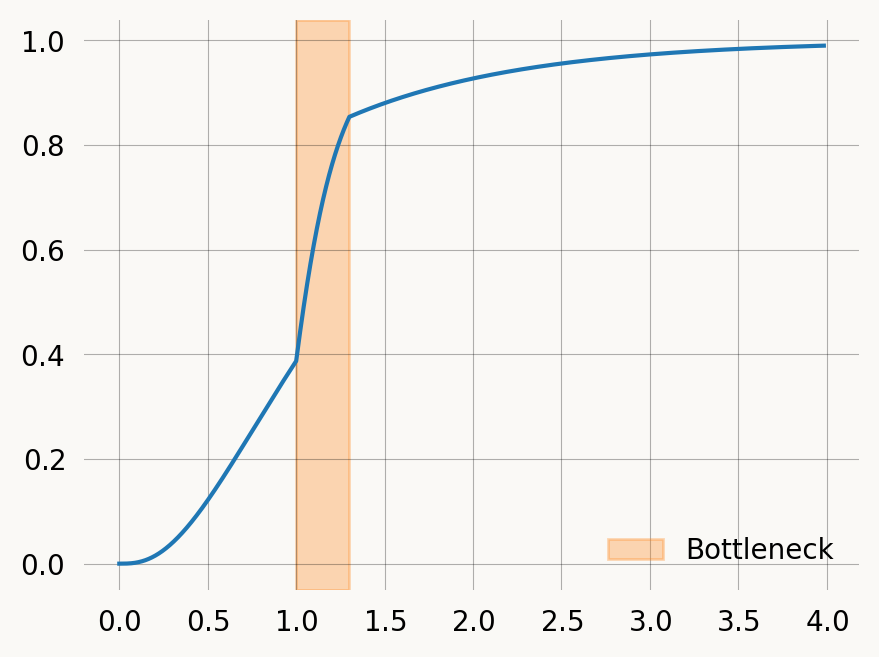 plt.plot(times, cdf) plt.axvspan(xmin=t_start, xmax=t_end, alpha=0.3, color=‘C1’, label=‘Bottleneck’) plt.legend() ;